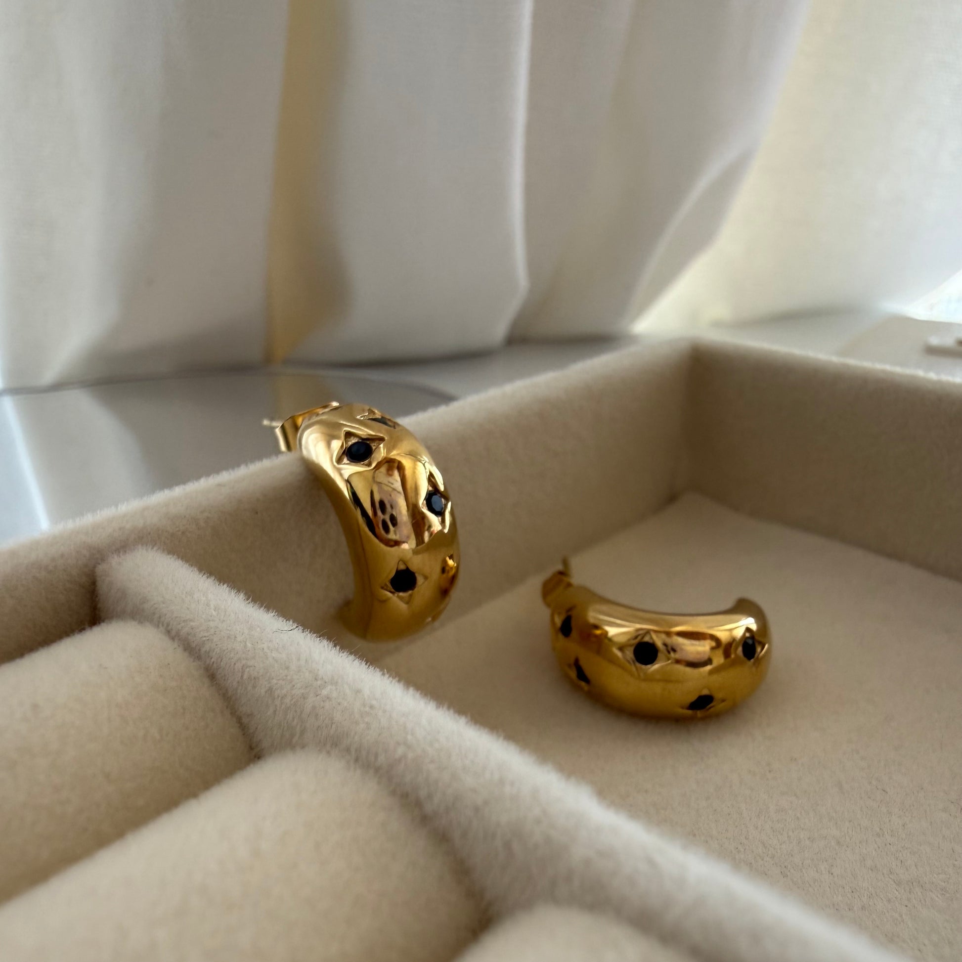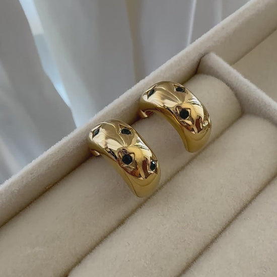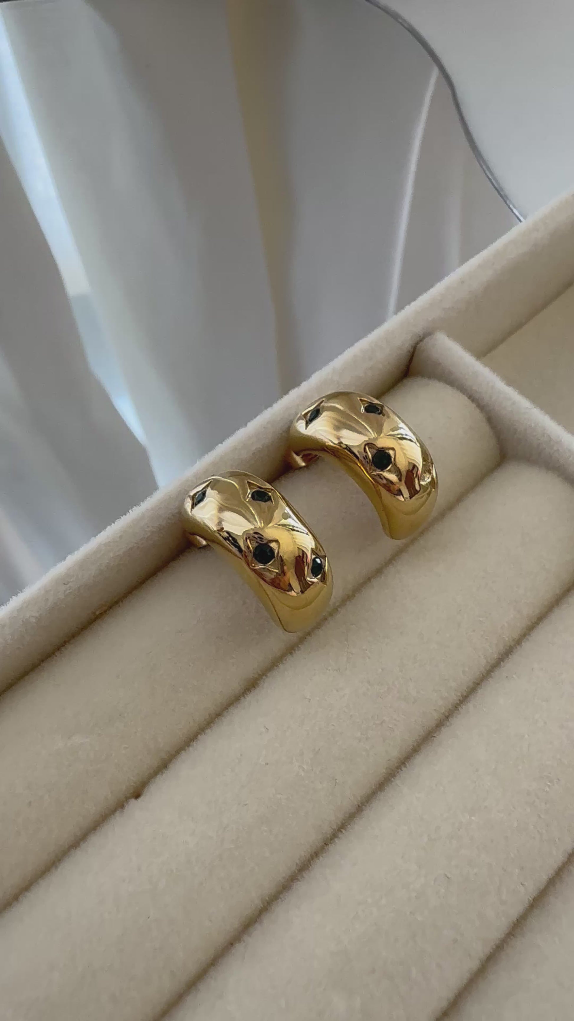 These chunky gold huggie hoop earrings are enhanced with dazzling emerald stones, combining bold sophistication with vibrant color. Perfect for the modern style enthusiast, the thick gold hoops paired with rich green emerald accents offer a timeless yet contemporary look ideal for any occasion. These statement earrings represent the top jewelry trend for 2025, making them an essential addition to any collection or a thoughtful luxury gift.